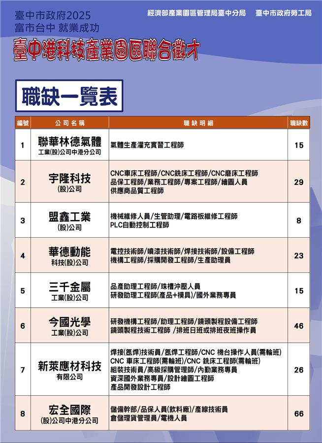🔍邀請臺中港科技產業園區優質廠商:宏全國際、今國光學、宇隆科技、新萊應材、華德動能、聯華林德氣體、三千金屬及盟鑫工業等8家,提供近228個多元工作職缺,提供求職者與企業廠商面試的機會,歡迎想求職或有轉職需求的民眾踴躍參加!