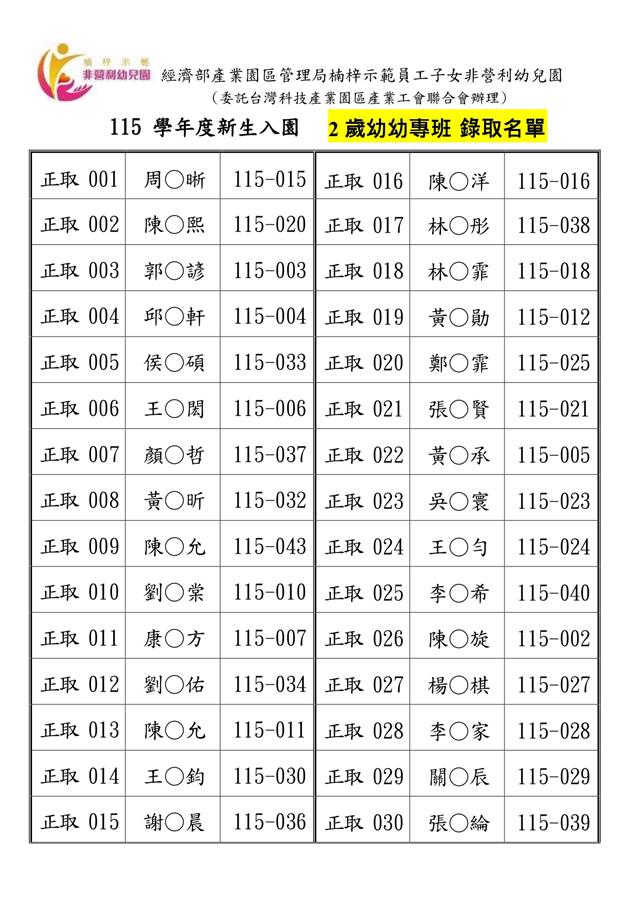 公告本局楠梓示範員工子女非營利幼兒園-115學年度新生就讀需求登記錄取名單