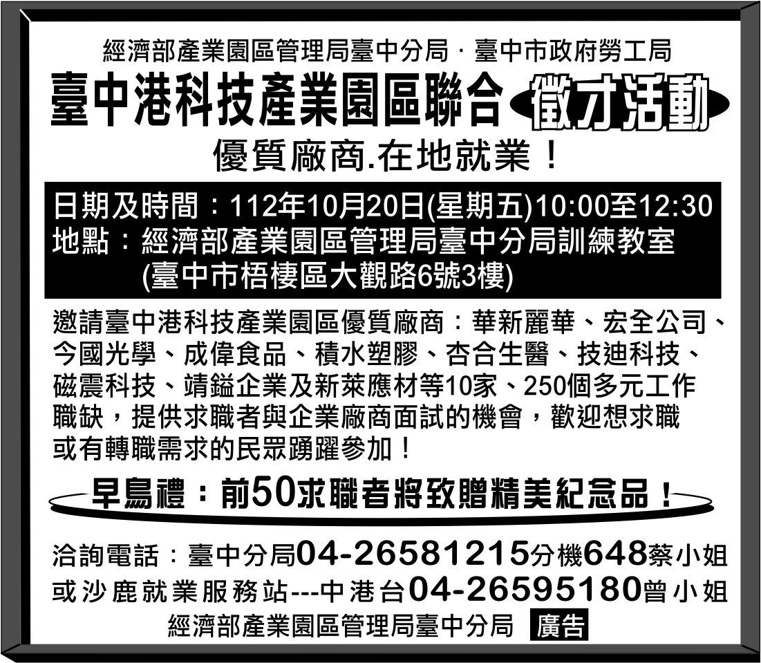 邀請臺中港科技產業園區優質廠商:華新麗華、宏全公司、今國光學、成偉食品、積水塑膠、杏合生醫、技迪科技、磁震科技、靖鎰企業及新萊應材等10家,提供250個多元工作職缺,提供求職者與企業廠商面試的機會,歡迎想求職或有轉職需求的民眾踴躍參加!