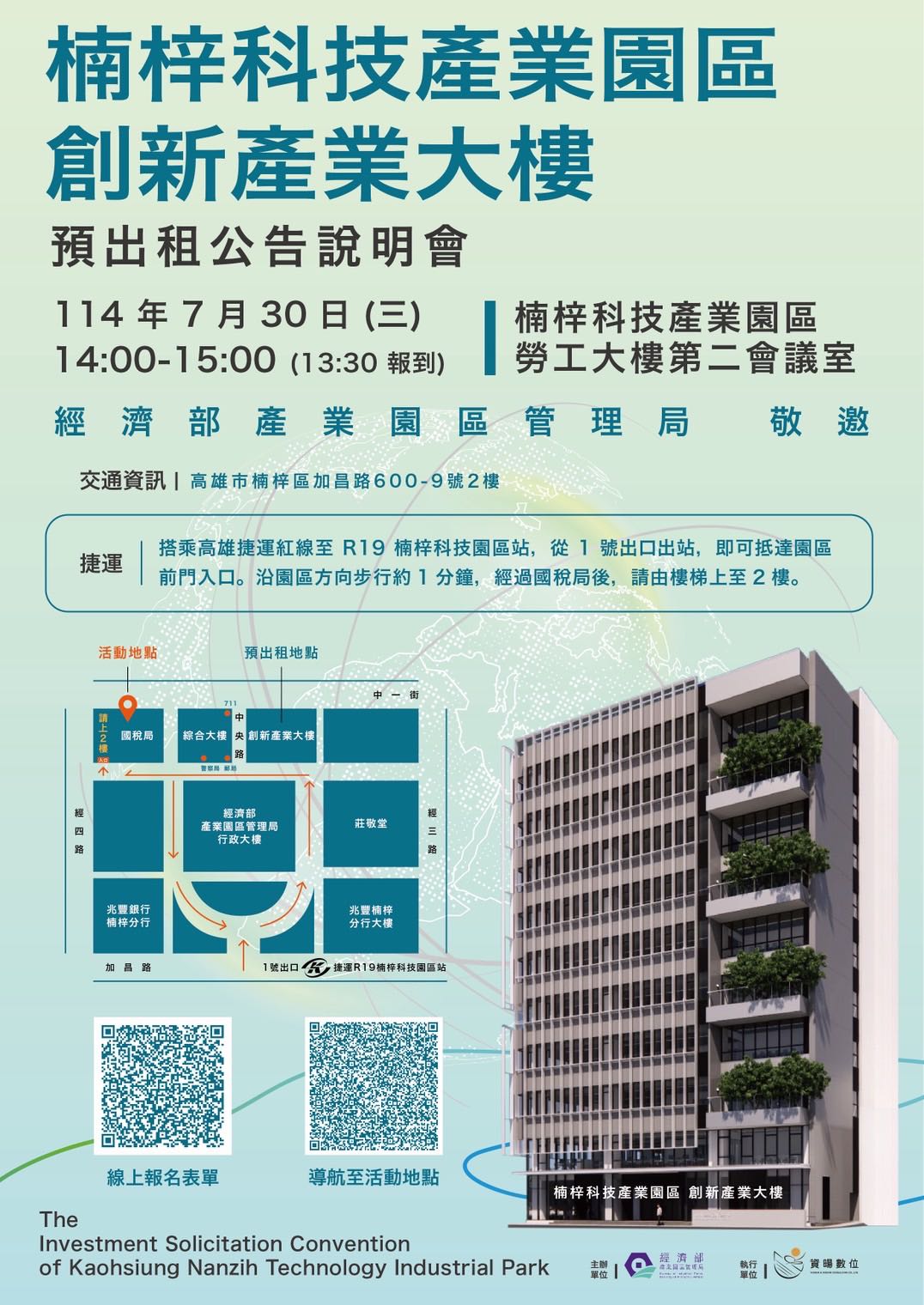 活動日期:114年7月30日 星期三活動時間:14:00-15:00 (13:30報到)活動地點:楠梓科技產業園區勞工大樓第二會議室 (高雄市楠梓區加昌路600-9號2樓)報名連結如下,如有任何問題或需要進一步了解,歡迎向本局洽詢聯繫窗口:陳小姐 0989-073-746活動報名連結:https://forms.office.com/r/EFzcMjZdtL