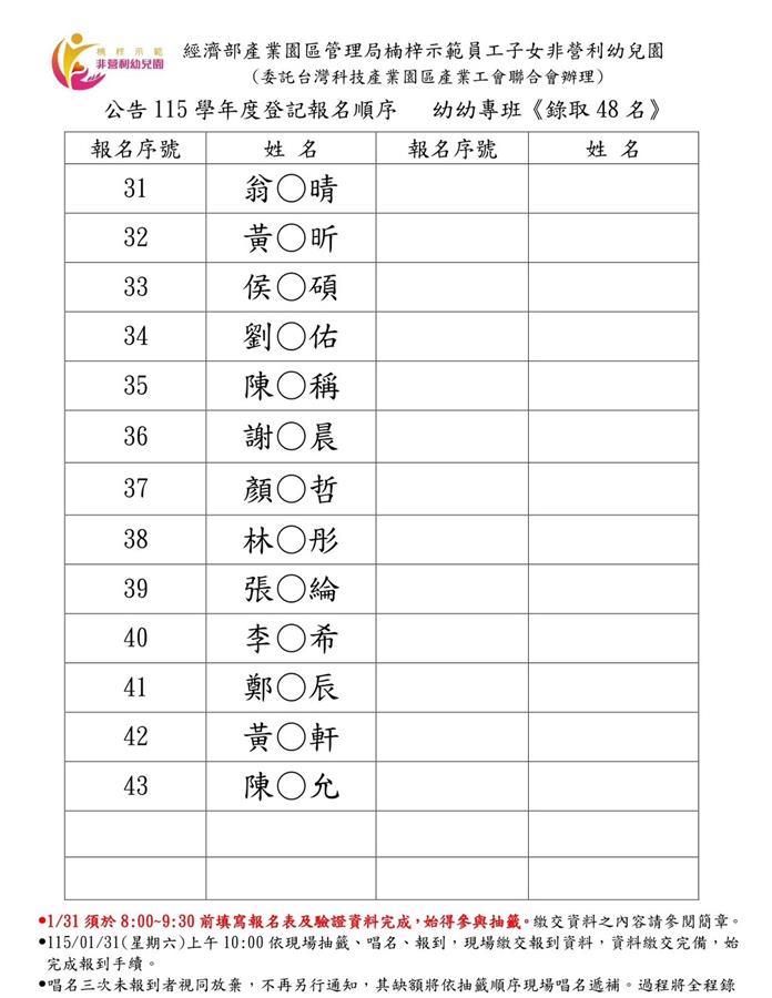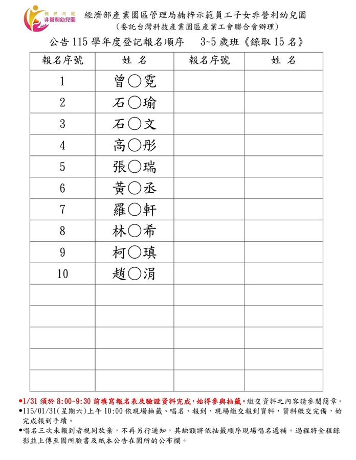 公告本局楠梓示範員工子女非營利幼兒園-115學年度新生就讀需求調查登記報名名單