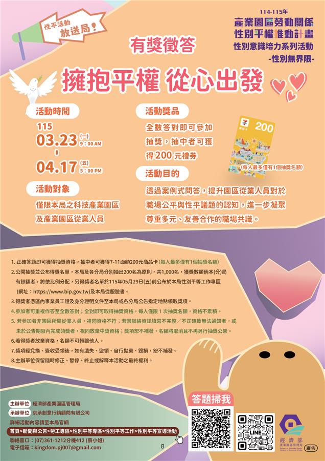 📅性平活動放送局:「性別無界限」系列活動開跑啦!另有「擁抱平權 從心出發」有獎徵答,全數答對可取得抽獎資格(每人限1次)。