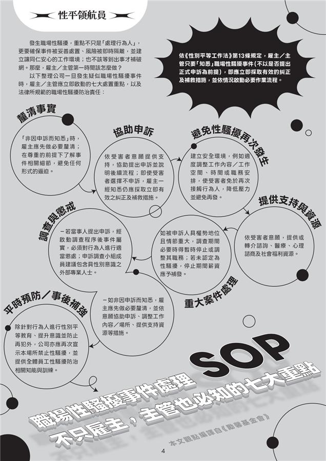 🧭性平領航員:整理職場性騷擾事件「知悉即啟動」SOP——釐清、協助申訴、隔離風險、資源支持、重大案件處置、調查懲戒、預防補強,主管與雇主都要會。