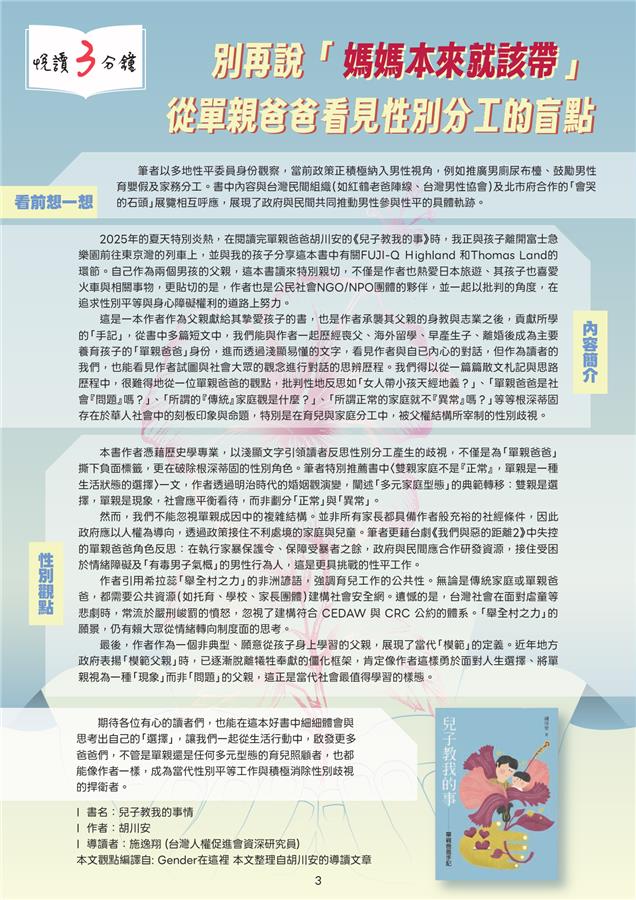 📚悅讀三分鐘:從單親爸爸視角反思「媽媽本來就該帶」的性別分工迷思,談多元家庭與育兒公共支持的重要。