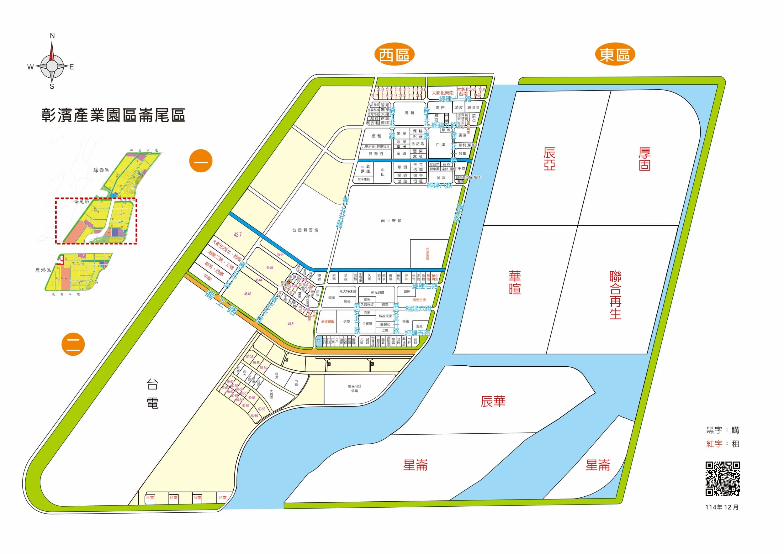 彰化濱海產業園區由北而南分為線西區、崙尾區與鹿港區三個區塊,以水道自然區隔。3,643公頃的開發範圍中,採分區、分階段的開發模式,設廠用地為2,078公頃,提供國內大規模產業用地。而1,202公頃的公共設施及環保用地,則完善的規劃有各類支援項目,包括服務中心、公園綠地、污水處理廠等,提供充足的擴充空間,以引進所需的周邊服務。此外,更規劃有廣闊的休憩用地、社區用地等,讓從業人員能有更臻完備的生活機能。