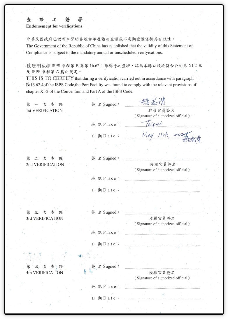 - 茲證明本港口設施經查證符合公約第XI-2章與船舶與港口設施保全章程(ISPS 章程)第A篇之規定,且本港口設施依據經認可之港口設施保全計畫操作。本計畫是用下列船舶: