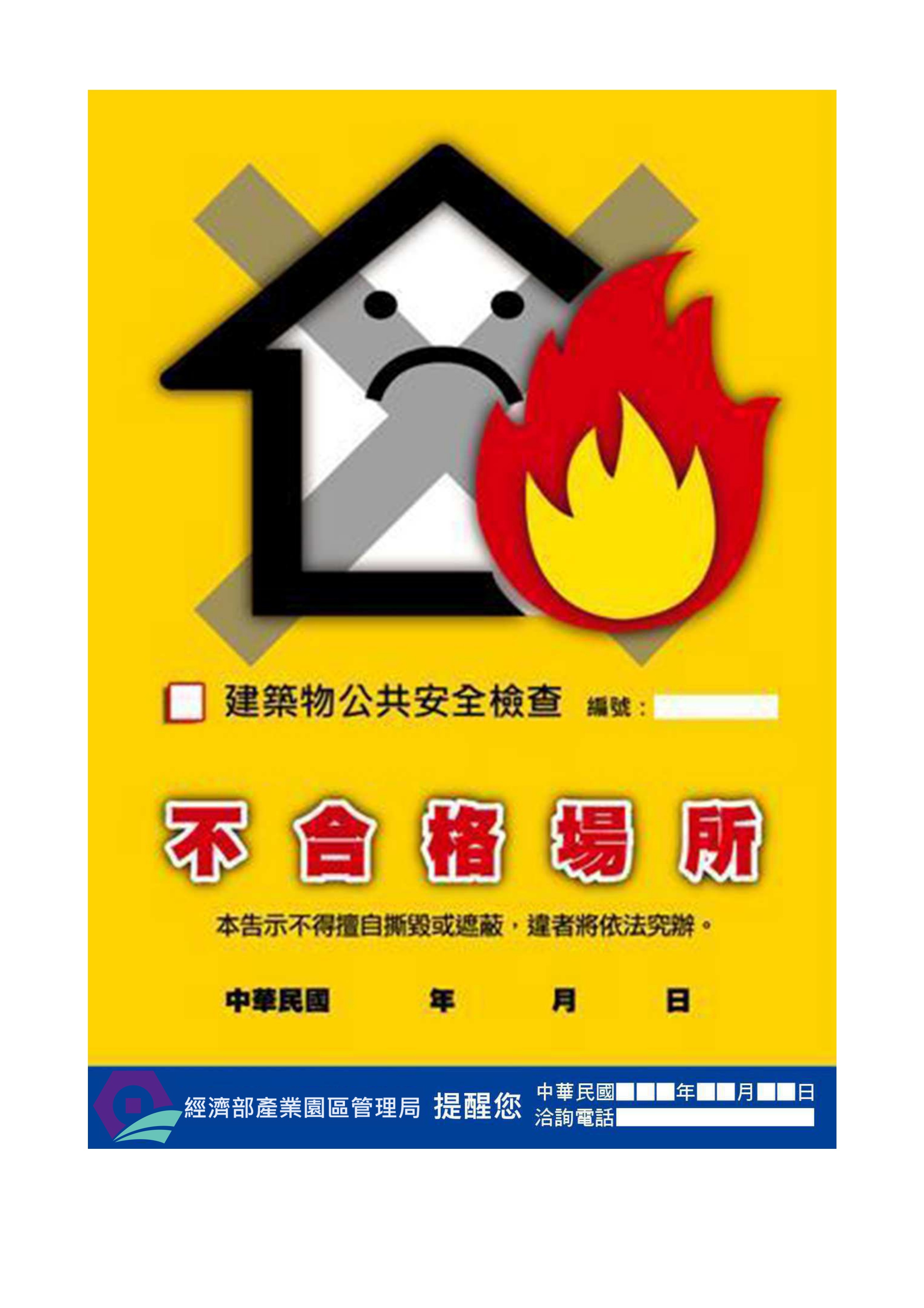 3.「科技產業園區建築物公共安全檢查不合格場所告示(標準檢查)」樣張